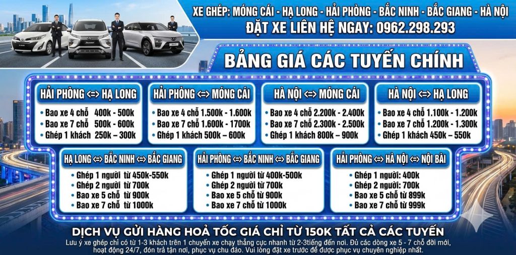 Hiện nay, dịch vụ xe ghép – xe tiện chuyến hoạt động mạnh trên các tuyến Móng Cái – Hạ Long – Hải Phòng – Hà Nội – Bắc Ninh – Bắc Giang, đáp ứng nhu cầu đi lại, công tác, du lịch và về quê của khách hàng mỗi ngày.